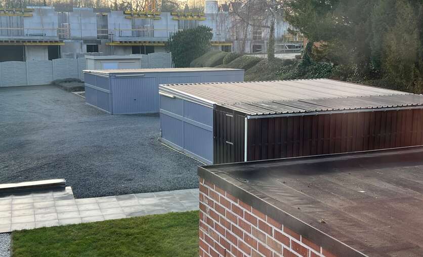 Parkeerbox achteraan het gebouw, te bereiken via een oprit naast het gebouw.