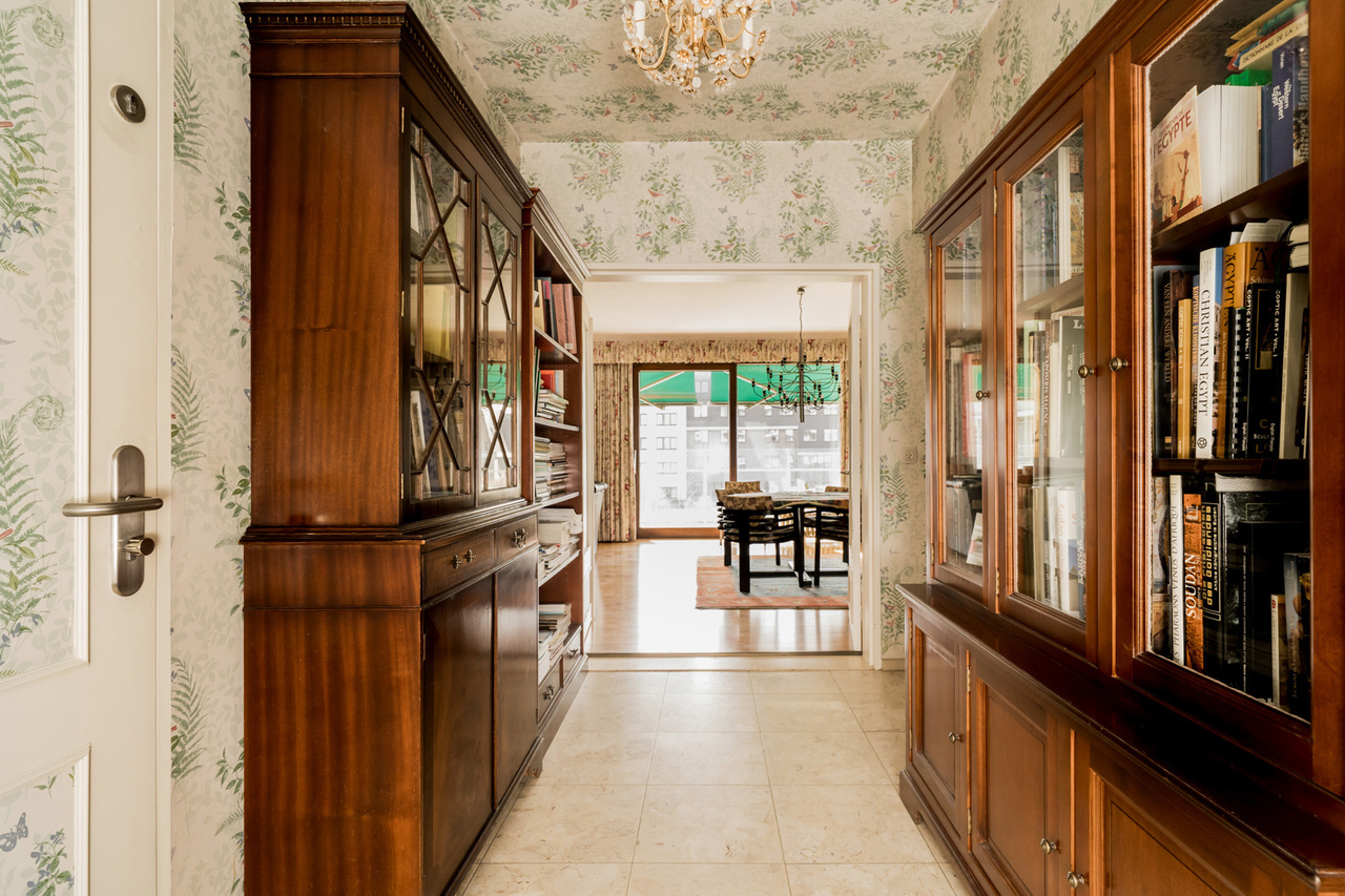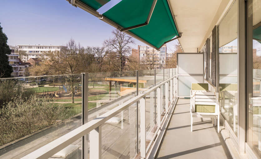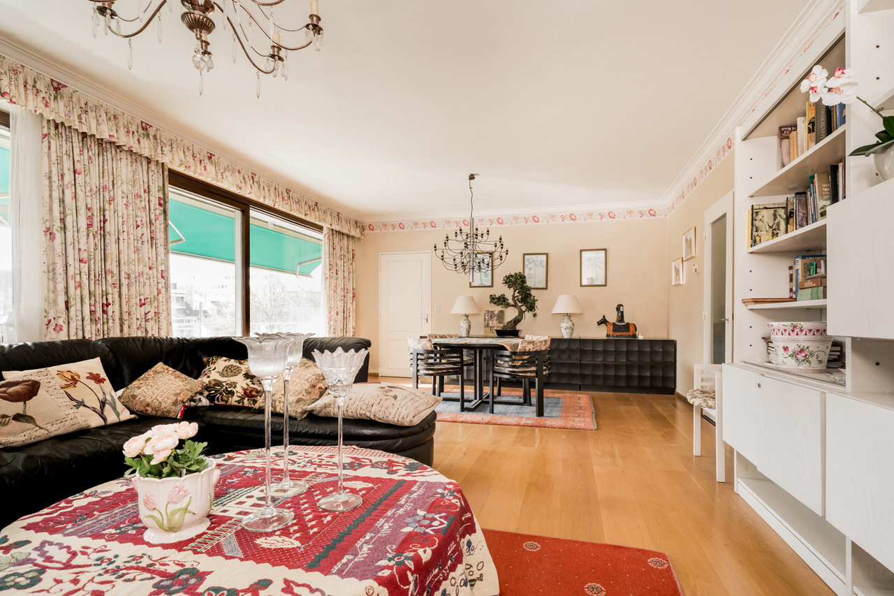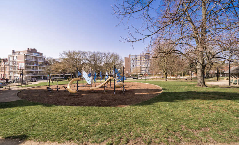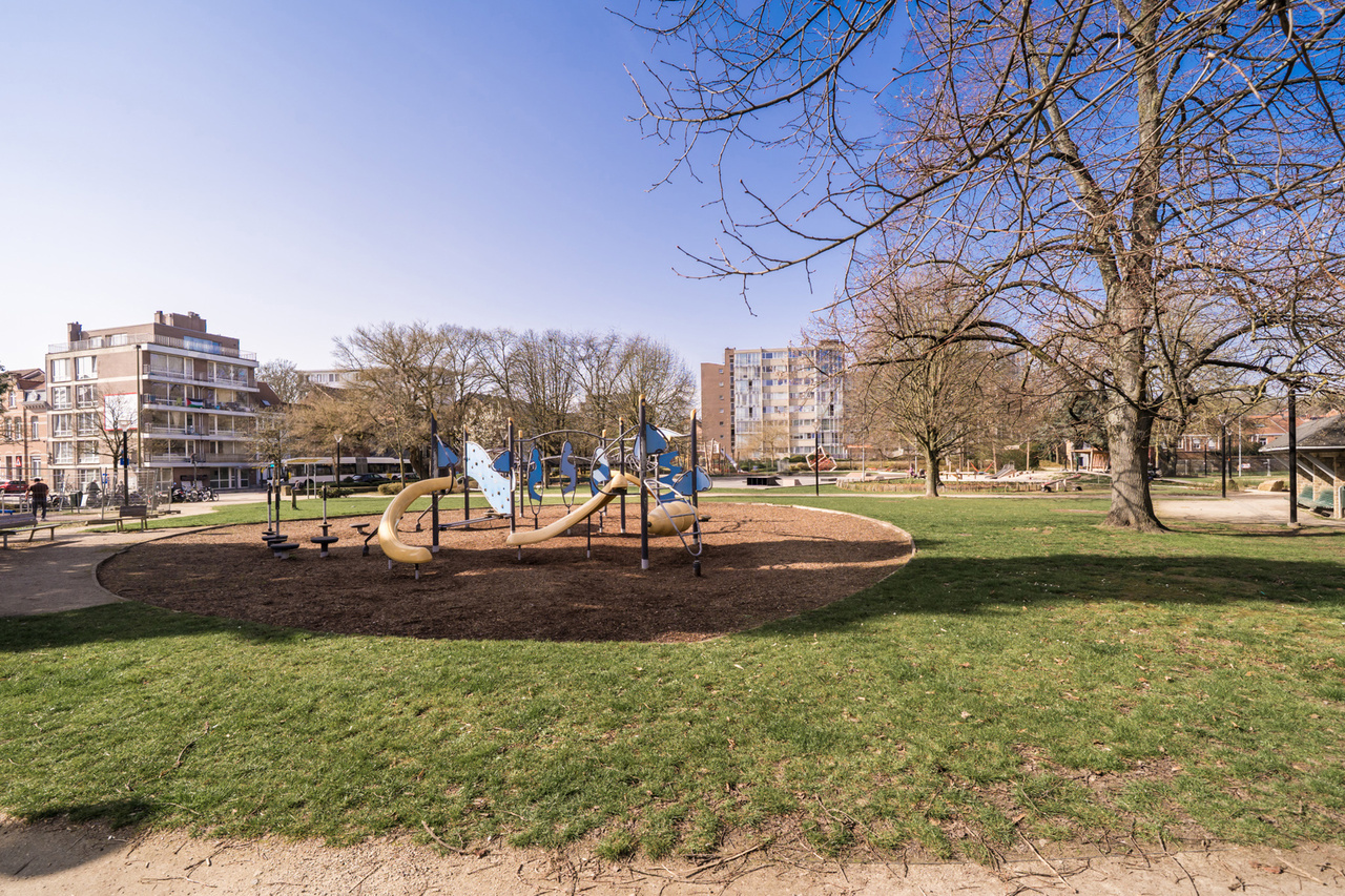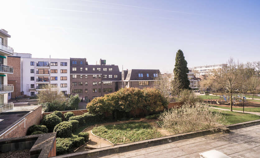 Het appartement van +/- 130 m² heeft een ruime inkomhal, een royale leefruimte (met parket) met groot zonneterras met zicht op het Bruul Park. Aansluitend is er een aparte keuken en een berging.