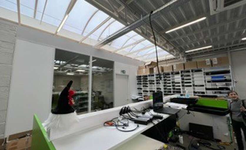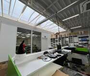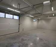 De loods is uitgerust met een grote en kleine toegangspoort en een dak met elektrische luifels.