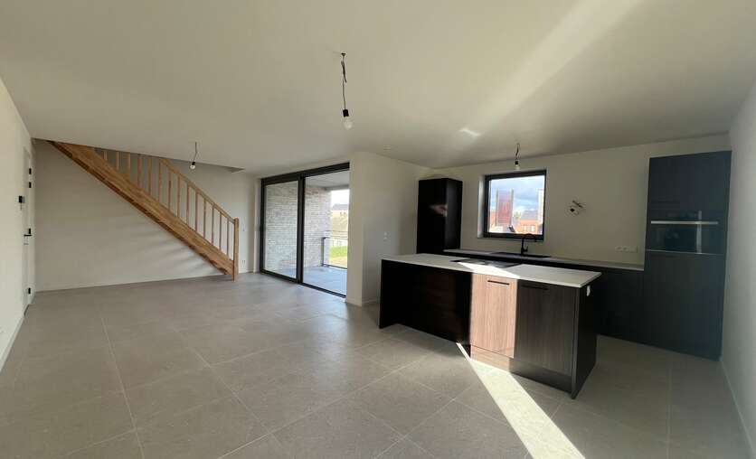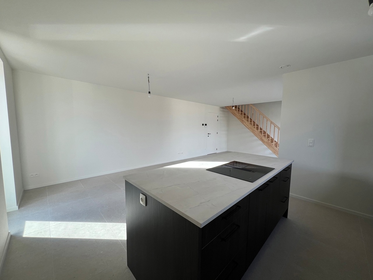 Lichtrijke leefruimte met een volledig uitgeruste keuken. Aansluitend is er een ruim overdekt terras.