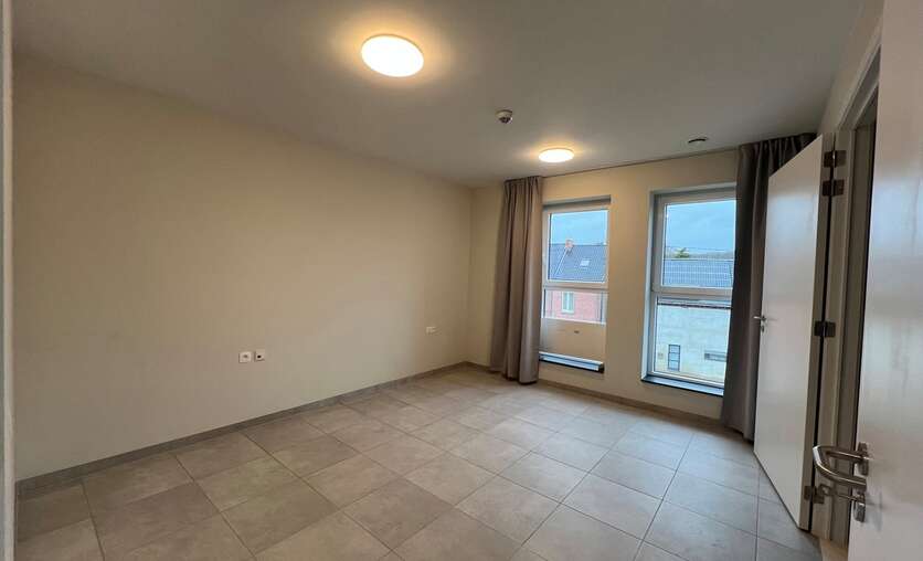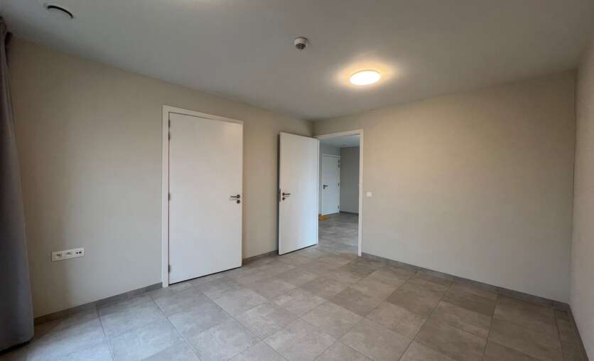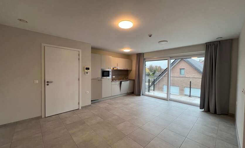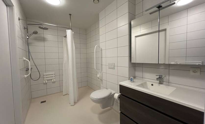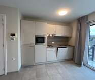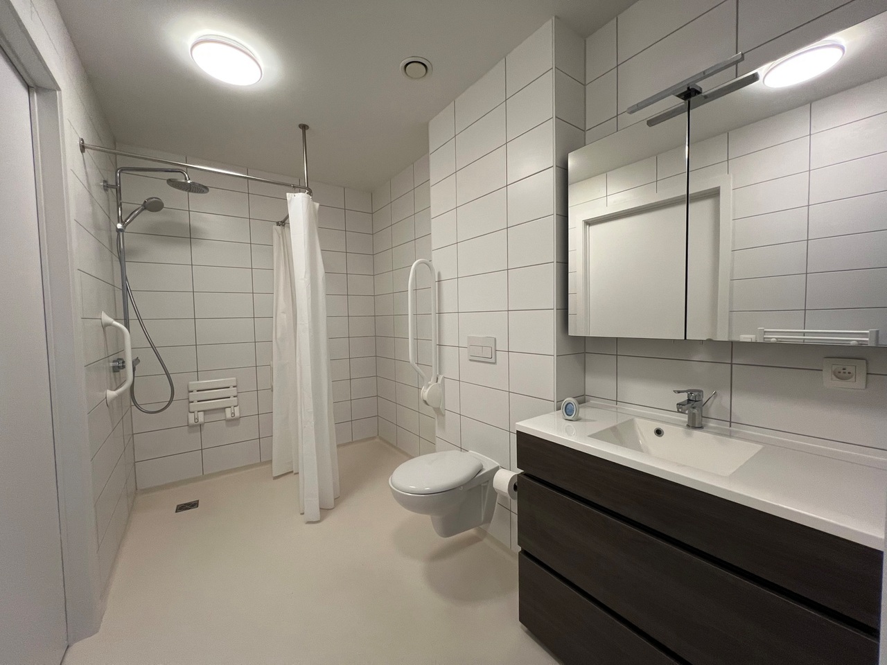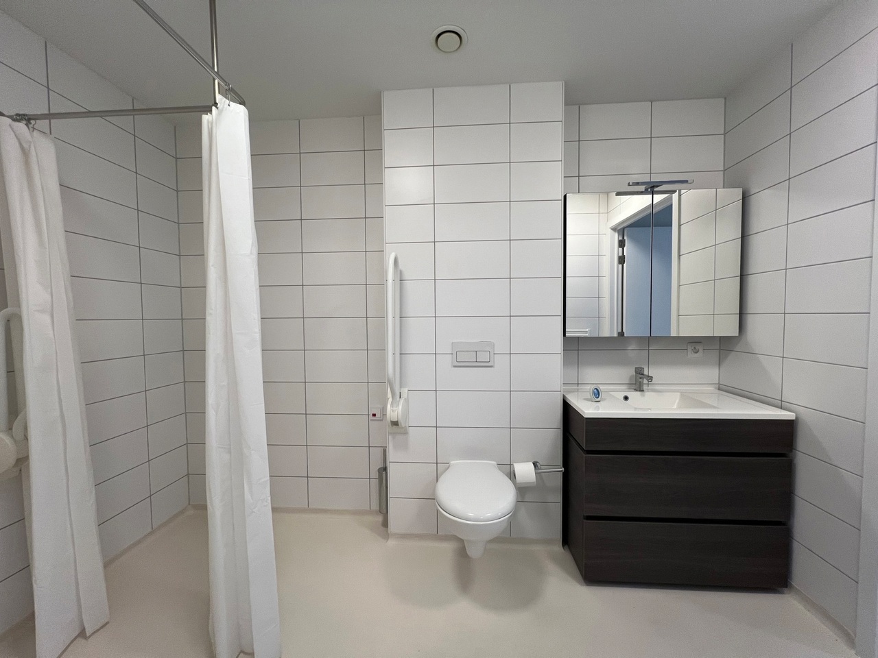 Dit hoekappartement op de bovenste verdieping heeft 1 grote slaapkamer met een aansluitende badkamer (inloopdouche, toilet en wasmeubel met spiegel). Een leefruimte met open ingerichte keuken (vaatwasser, klein kookfornuis, koelkast met diepvriesvak). Berging met aansluiting voor wasmachine. Terras van 5m².