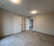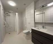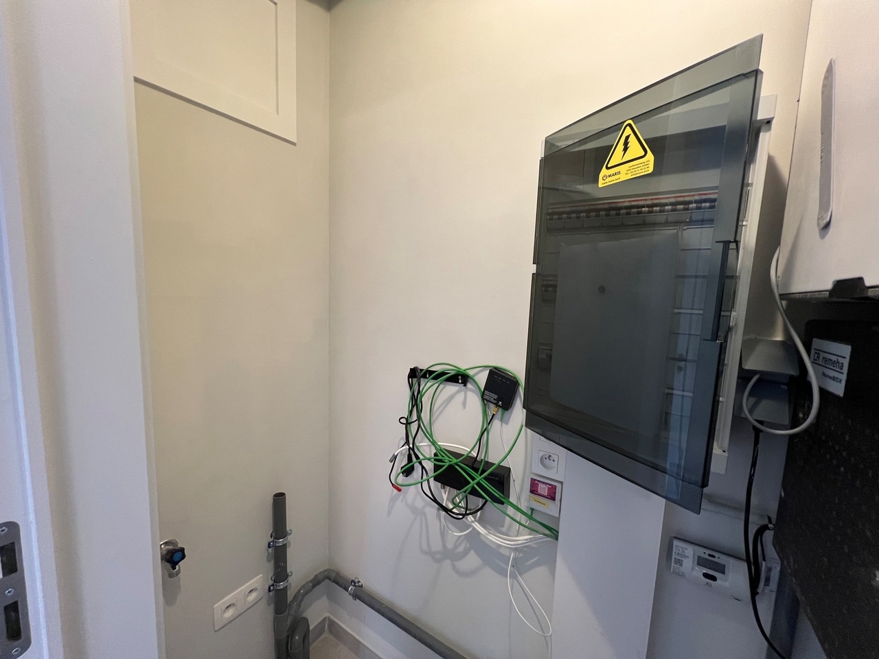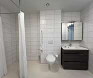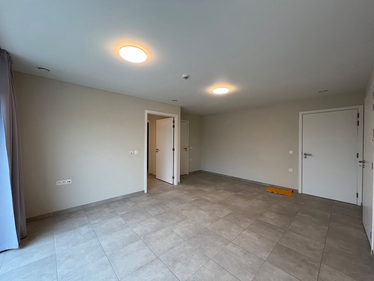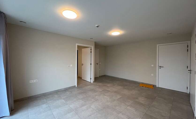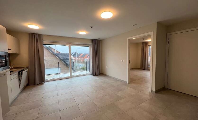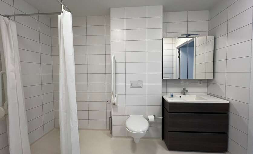 Dit hoekappartement op de bovenste verdieping heeft 1 grote slaapkamer met een aansluitende badkamer (inloopdouche, toilet en wasmeubel met spiegel). Een leefruimte met open ingerichte keuken (vaatwasser, klein kookfornuis, koelkast met diepvriesvak). Berging met aansluiting voor wasmachine. Terras van 5m².