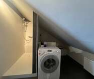 Badkamer met douche, wastafel, aansluiting wasmachine en toilet.