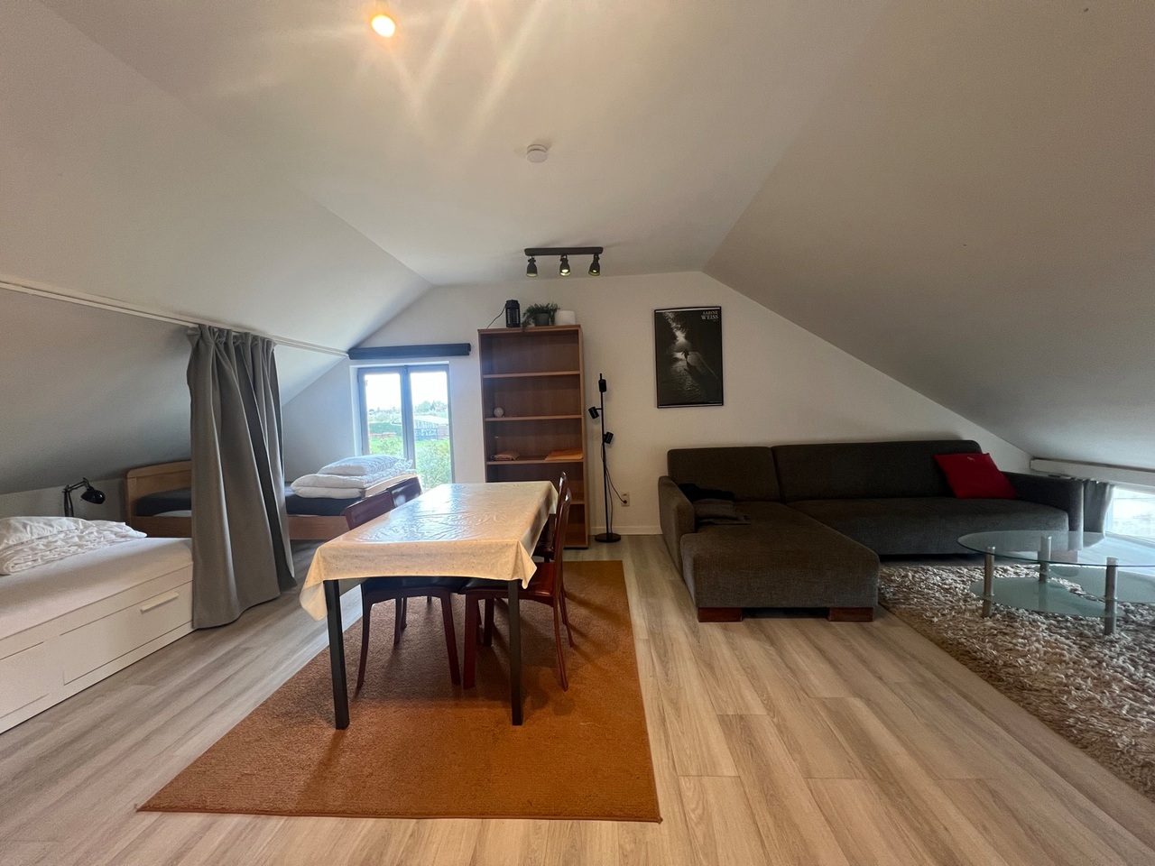 Inkomhal, ruime living met veel lichtinval, slaapkamer,