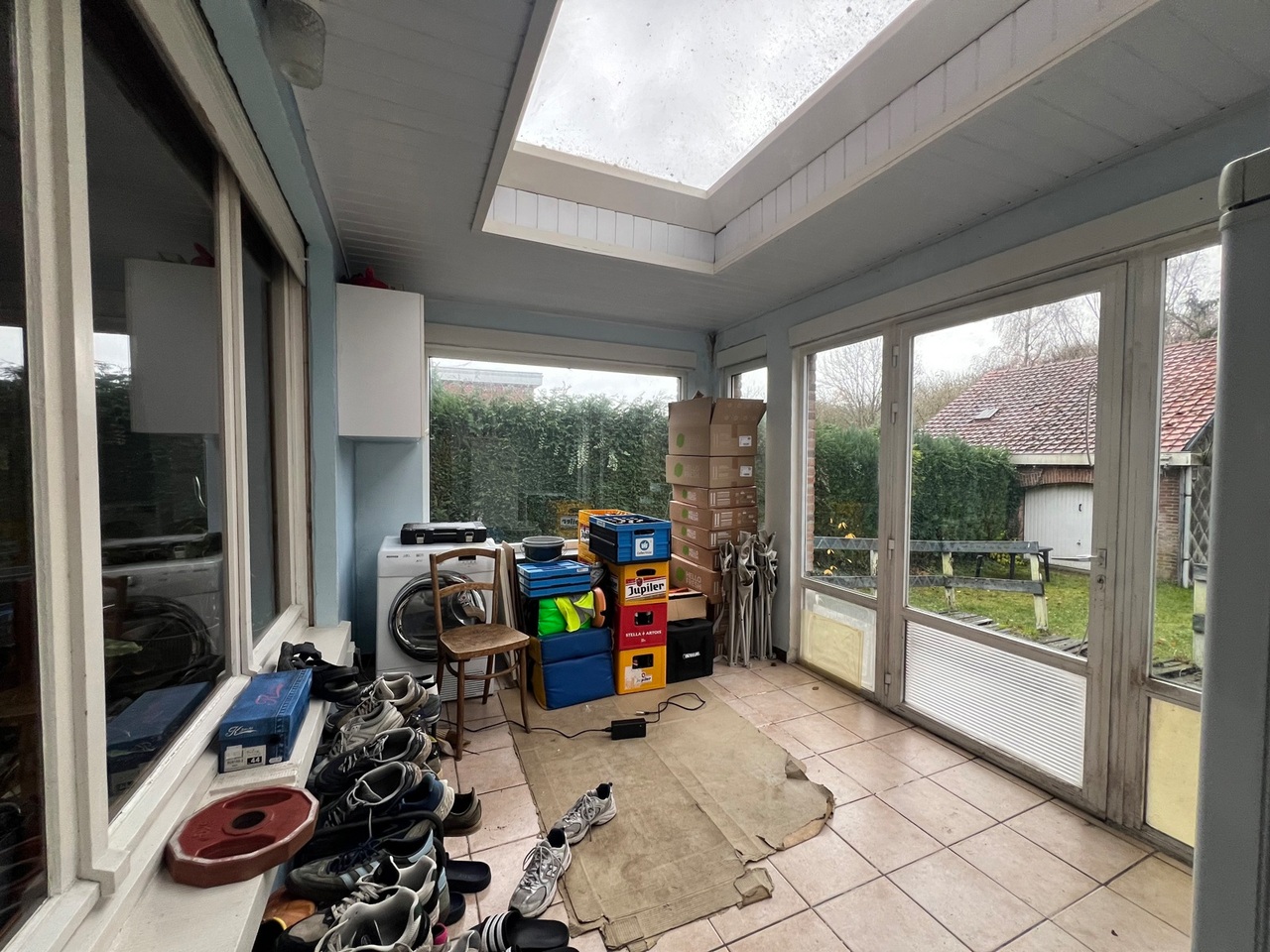Gelijkvloers: Inkomhal met vestiaire en apart gastentoilet, woonkamer en eetplaats, keuken, veranda, terras en tuin, garage en atelier.