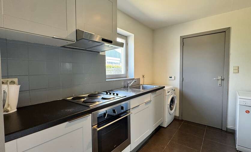 Je komt de woning binnen in de lichtrijke woonkamer met eetplaats dat via een schuifraam toegang geeft tot het terras en de tuin.