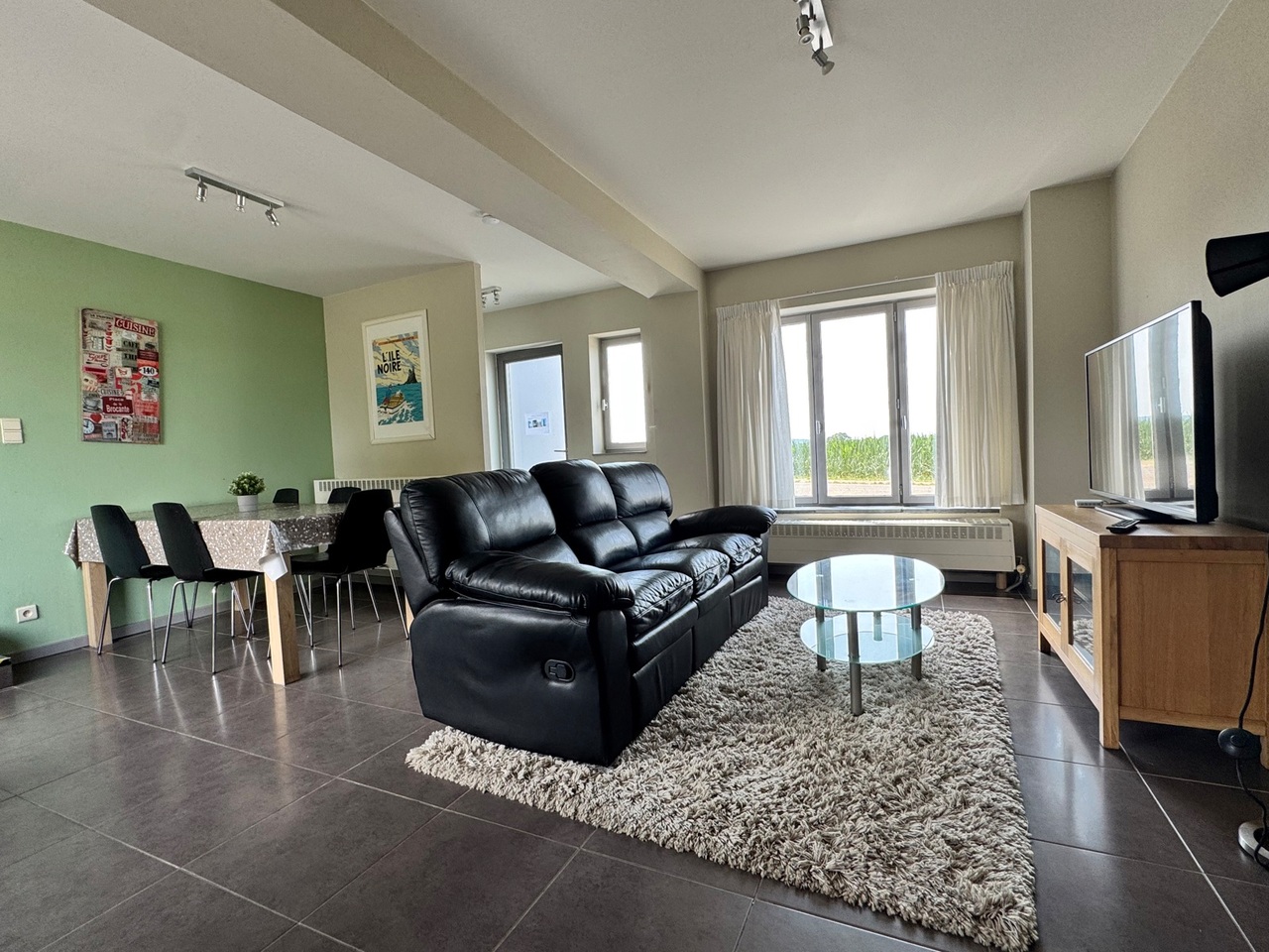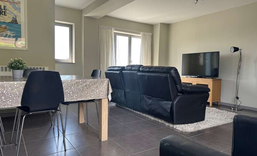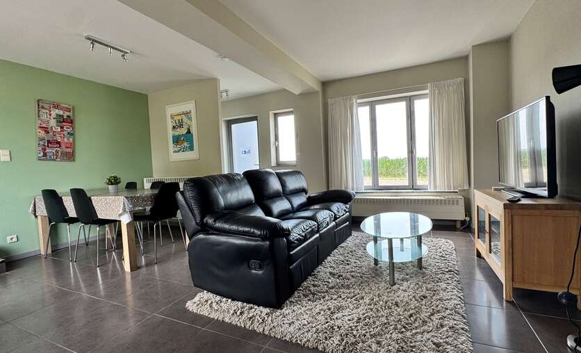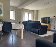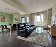 Je komt de woning binnen in de lichtrijke woonkamer met eetplaats dat via een schuifraam toegang geeft tot het terras en de tuin.