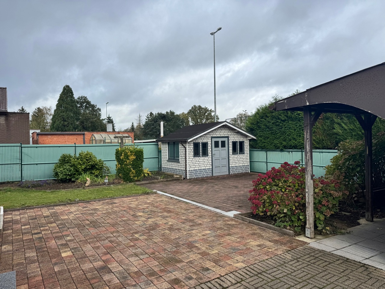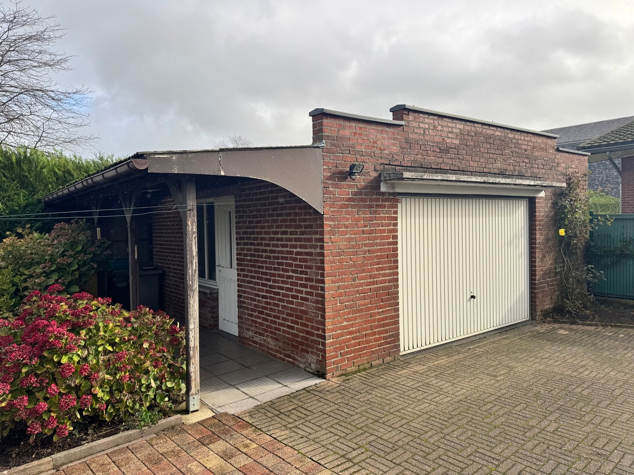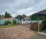 Achteraan de woning is er een terras/tuin en een apart garagegebouw aanwezig.