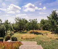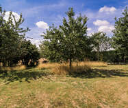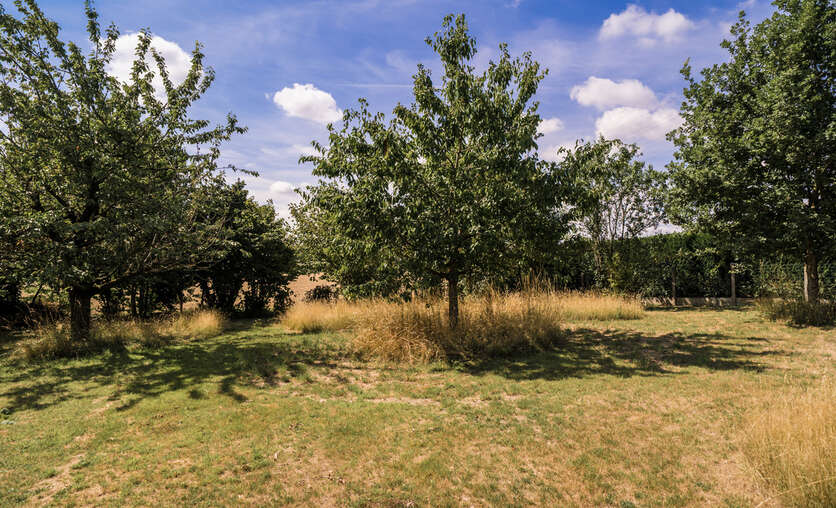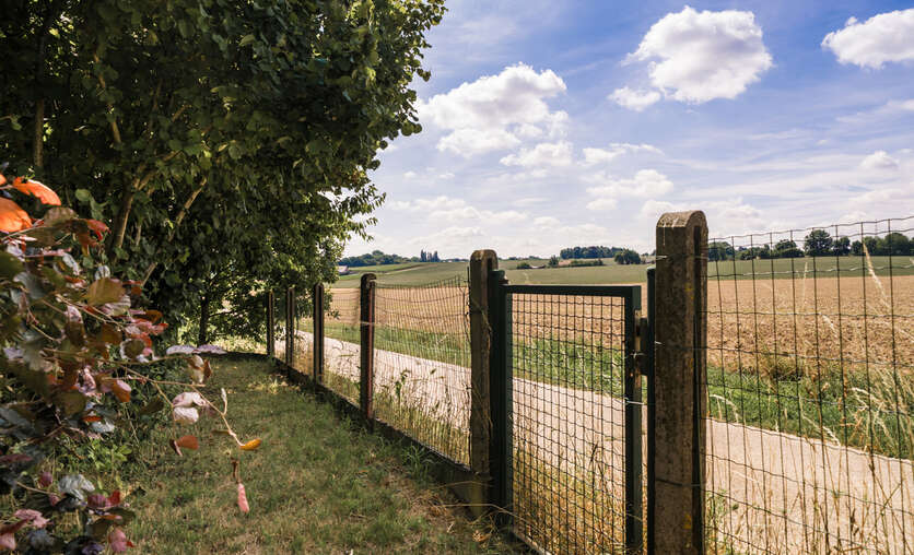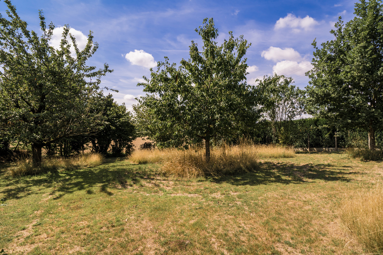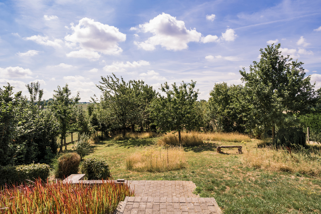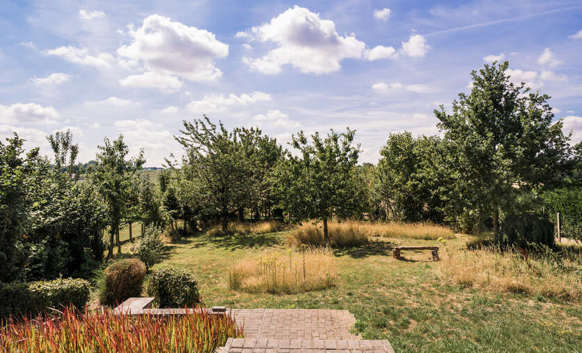 Prachtige, zuid-gerichte tuin met fruitbomen en een adembenemend vergezicht op de achterliggende velden