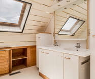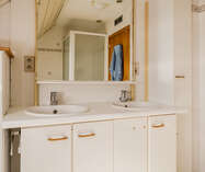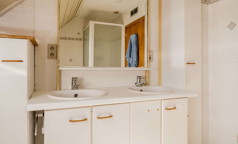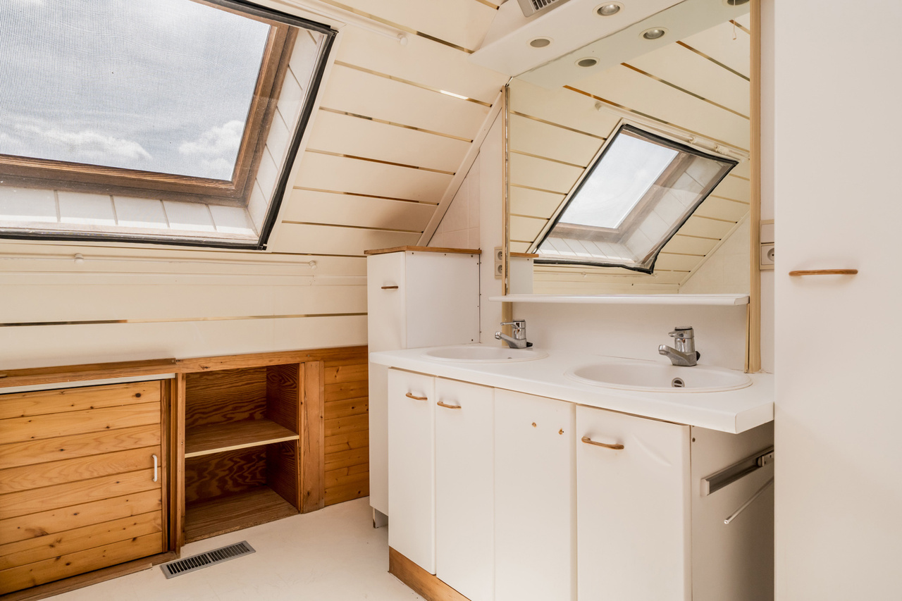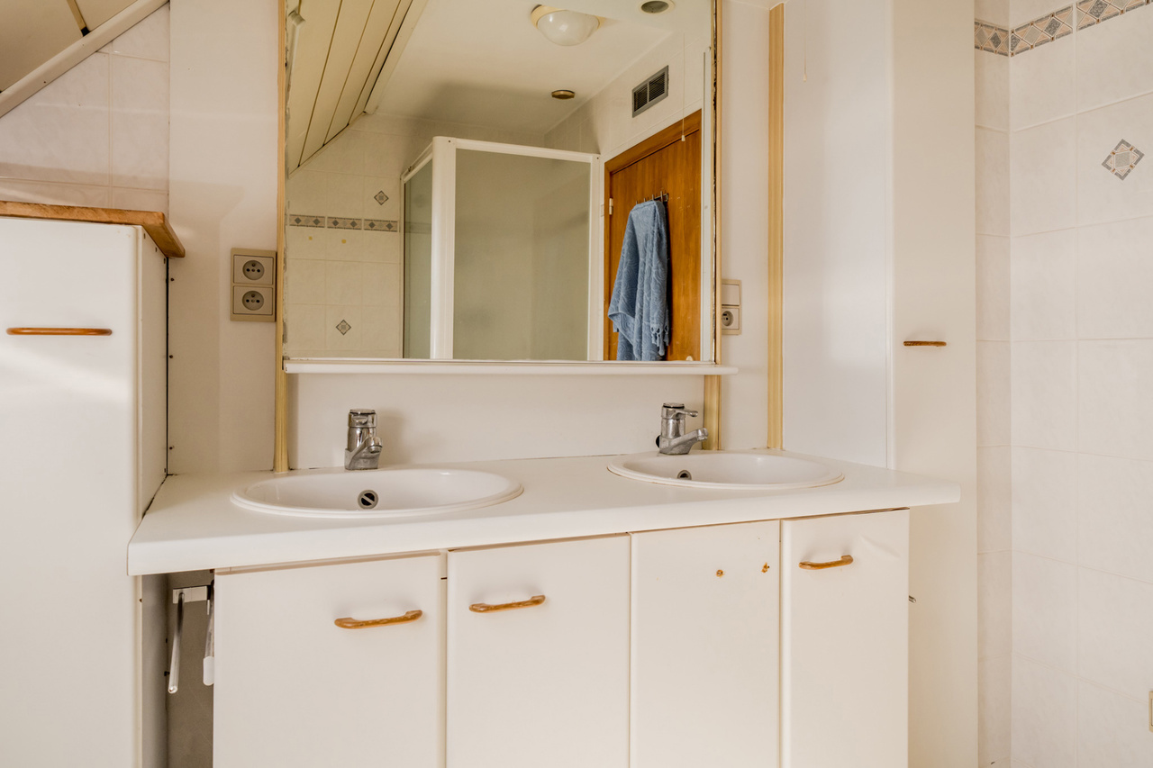 Op de eerste verdieping zijn er 3 x slaapkamers en een badkamer met wandmeubel met 2 x lavabo, een douche en een toilet.