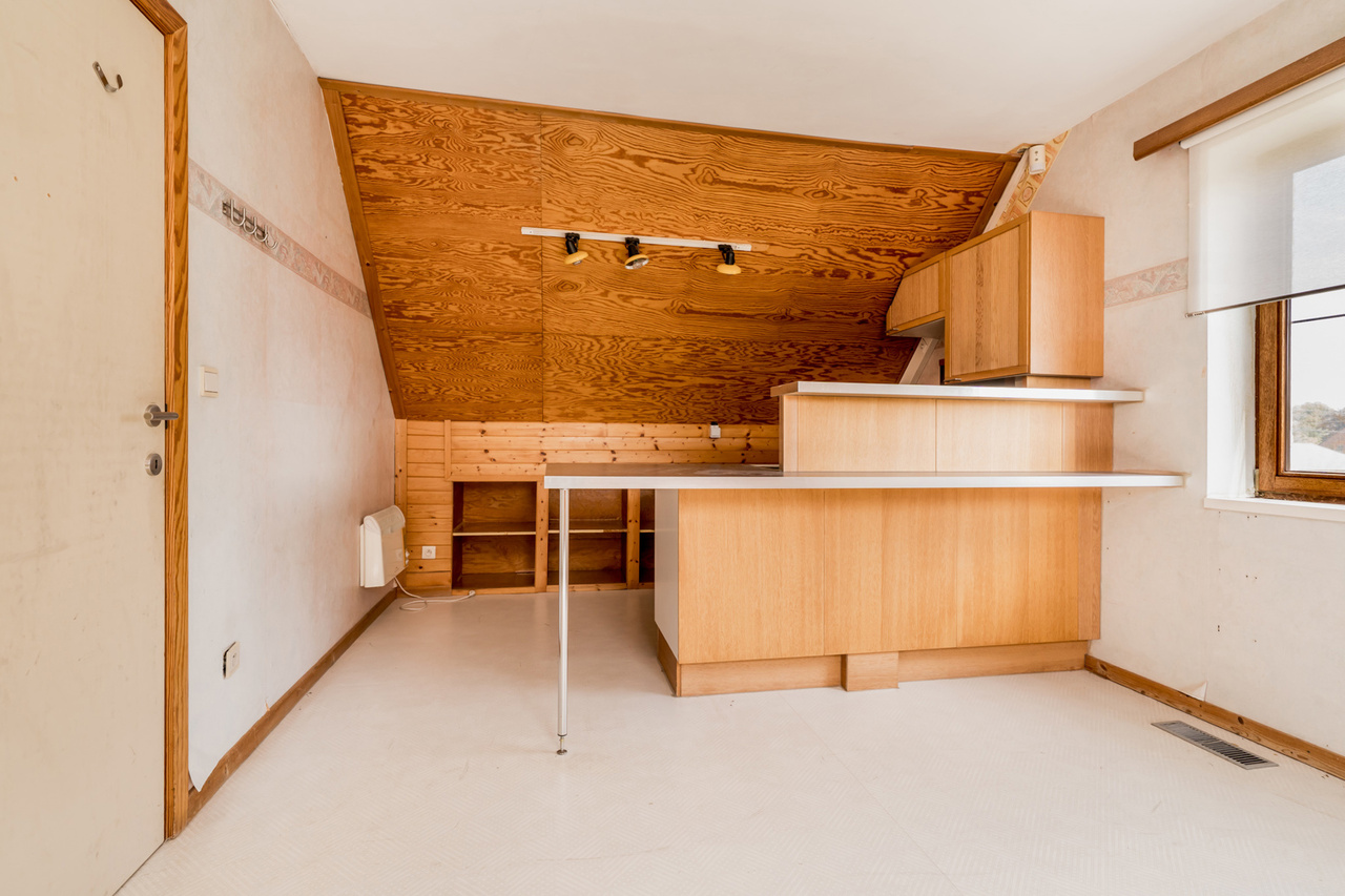 De woning heeft een inkomhal, toilet, Ruime woonkamer met eetplaats en aansluitend is er een aangename veranda met zicht en toegang naar de tuin. Ingerichte keuken. Bureel of slaapkamer (voorheen garage).