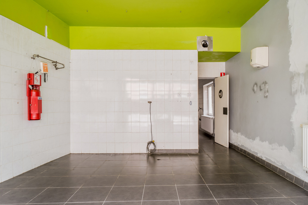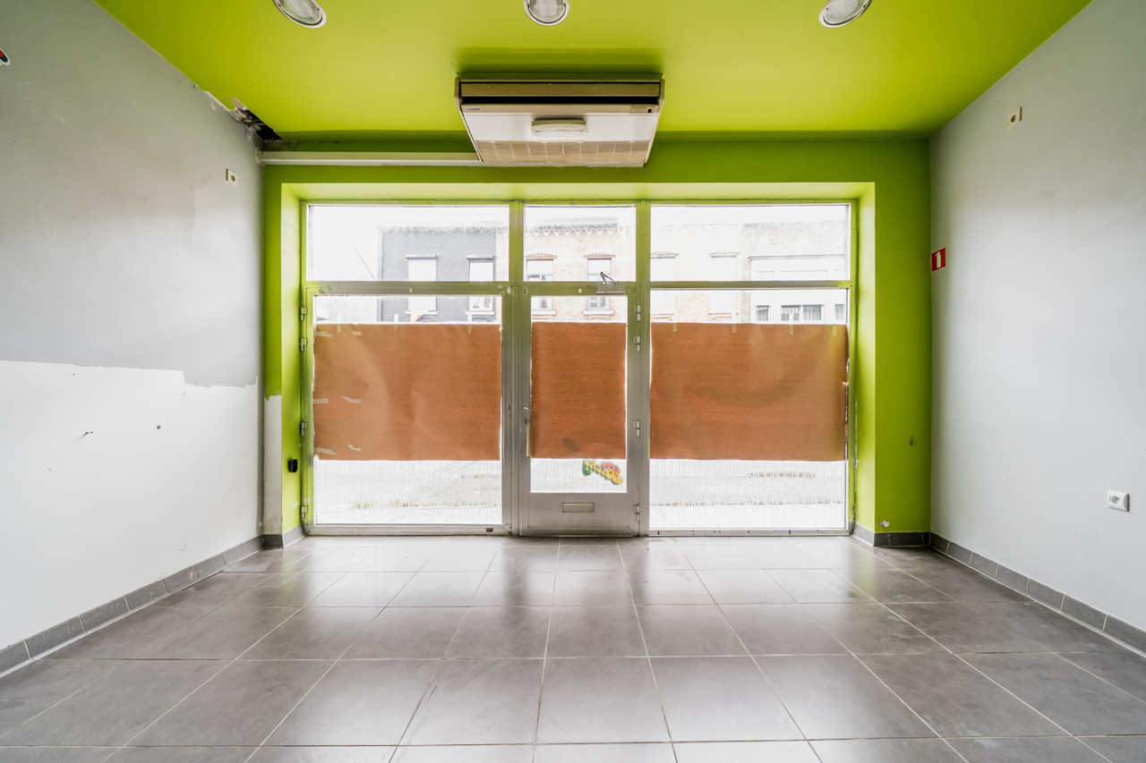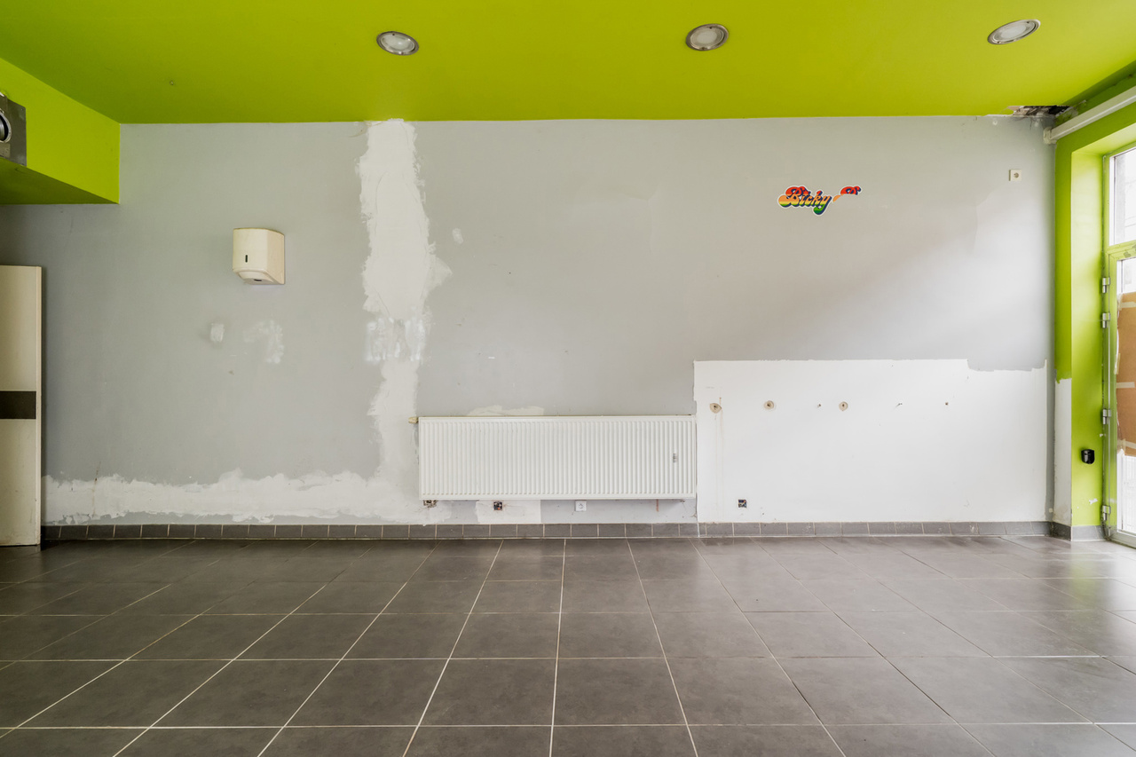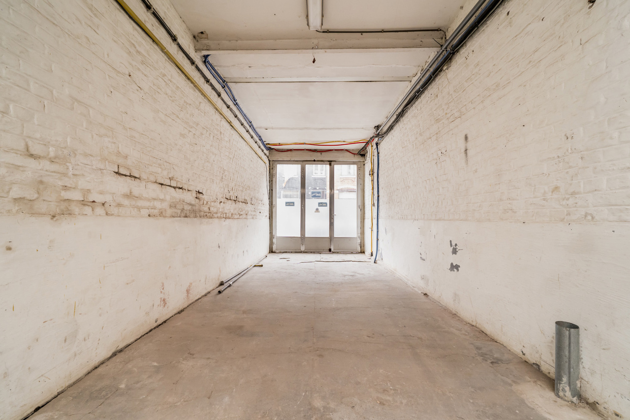 Het gelijkvloers omvat een winkel- of kantoorruimte, perfect voor een vrij beroep of zelfstandige activiteit. Achteraan bevinden zich een berging en badkamer of sanitair, evenals een voorraadkelder.