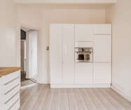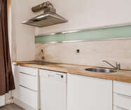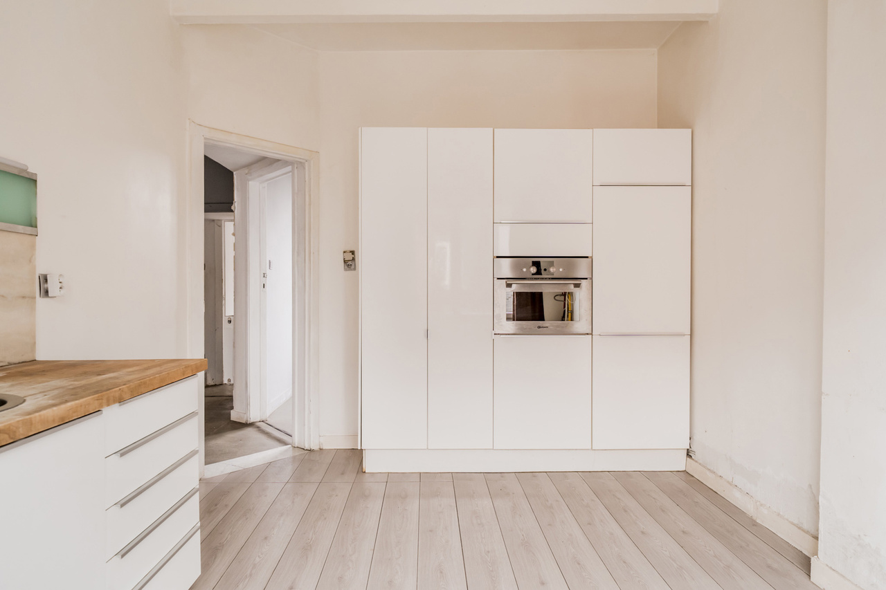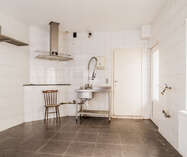 De eerste verdieping is ingericht als woonruimte of appartement met een ingerichte keuken, eetplaats, gezellige woonkamer, berging, slaapkamer en badkamer — alles wat je nodig hebt voor comfortabel wonen.