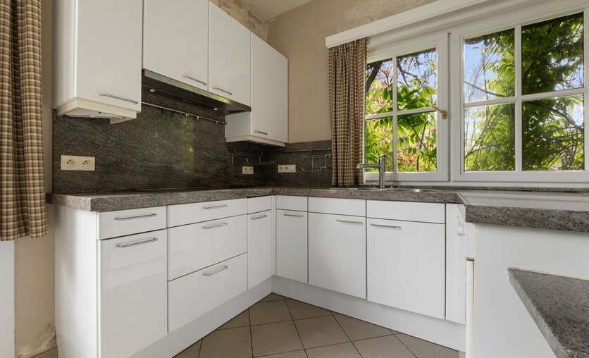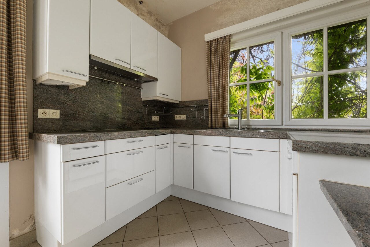 De keuken is eenvoudig en dient vernieuwd te worden. Ook de tuin – ooit een ware oase – is momenteel wat verwilderd, maar biedt enorm veel potentieel voor wie droomt van een uitgestrekte, groene buitenruimte rondom de woning.